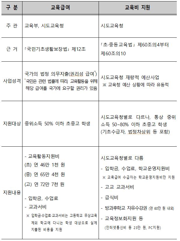 μλμ΄ μ μ΄ μλ μ μμ§μ κ΅μ‘κΈ°νλ₯Ό μ 곡νμ§ λͺ»νλ μν©μ λ§λ€μ§ μκΈ° μν΄μ κ΅κ°κ° μ 곡νλ 볡μ§μ λμΈ κ΅μ‘κΈμ¬λ 2023λ λλΉ 11% μμΉλμ΄ μ΄λ±νμ 461,000μ, μ€νμ 654,000μ, κ³ λ±νμ 727,000μμ λ°μ°μ²λ‘ μ§μνμ¬ κ΅μ‘νλ μ§μλΉμ κ΅κ³Όμ λκΈ, μ νκΈ λ° μμ λ£λ‘ μ¬μ©νμ€ μ μμΌλ©° κ΅μ‘νλ μ§μλΉμ κ²½μ°μλ μ° 1ν μ 곡λκ³ μμ΅λλ€. κ·Έλ°μ κ΅κ³Όμ λκΈκ³Ό μ νκΈ, μμ λ£μ κ²½μ° κ³ κ΅ λ¬΄μκ΅μ‘ λ―Έμ€μ νκ΅μ μ¬νμ€μΈ κ²½μ°μ νν΄ λ°μλλ κΈμ‘ μ 체λ₯Ό μ§κΈν©λλ€. κ΅μ‘κΈμ¬ μ§μ λμμ¬λΆλ₯Ό νμΈνμ¬ κ΅κ°μμ μ§μνλ ννμ κΌ λ리μκΈ° λ°λλλ€.