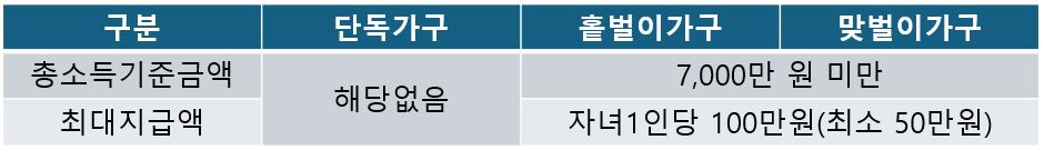 ์ ์๋ ๊ฐ๊ตฌ์ ์๋ ์์ก์ ์ง์ํ๊ธฐ ์ํด ์ด์๋(๋ถ๋ถํฉ์ฐ) 7,000๋ง์ ๋ฏธ๋ง์ด๋ฉด์ ๋ถ์์๋ (18์ธ ๋ฏธ๋ง)๊ฐ ์๋ ๊ฒฝ์ฐ 1์ธ๋น ์ต๋ 100๋ง์(์ต์50๋ง ์)์ ์ง๊ธํ๋ ์ ๋๋ก ์ด์๋ ๊ธฐ์ค์ ์ ์ธํ ๋๋จธ์ง ์๊ธ์๊ฑด์ ๊ทผ๋ก์ฅ๋ ค๊ธ๊ณผ ๋์ผํฉ๋๋ค.